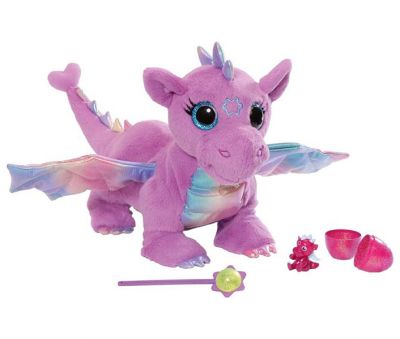 Uszyta z miękkiego przyjemnego dotyku pluszu smocza mama ma brzuszek, skrzydła, grzebień i ogon wykonany z mieniącej sie tęczowej tkaniny.Jak przystało na zamieszkujacą magiczną krainę bohaterkę posiada ona niezwykłe funkcje. Po naciśnieciu lewego ucha włącza sie melodia , usłyszymy...
