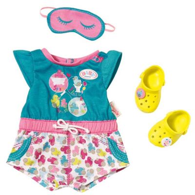 Ubranko Piżamka z butami to niezbędny zestaw dla laleczki. Komplet składa się ze ślicznej piżamki na lato, w żywej kolorystyce, crocsów w limonkowym kolorze i osłonki na oczy. Ubranko przeznaczone dla lalek 43 cm. Zestaw nie zawiera lalki.