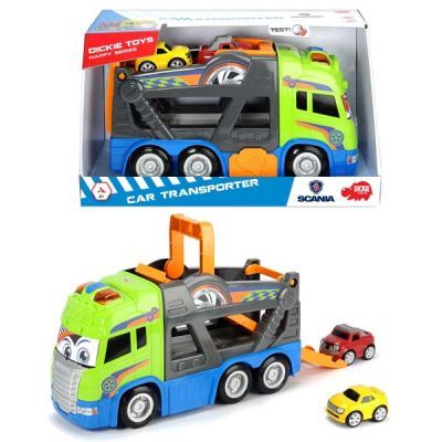 DICKIE Happy Samochód Laweta Scania 42 cm + 2 AutaLaweta posiada przyjazne dla maluchów oczy na przedniej szybie. Dodatkowo wyposażona została w ruchome gumowe koła, otwieraną rampę dla samochodzików z gumową karoserią, które znajdują się w zestawie. Lawetę opuszcza się za pomocą...