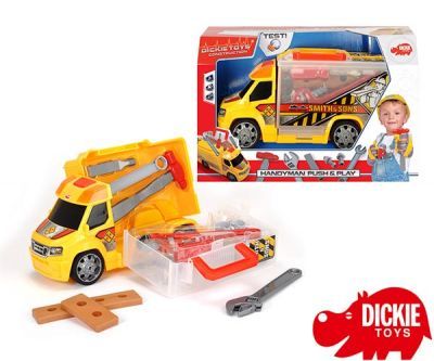 Wspaniały samochód z narzędziami firmy Dickie to wymarzona zabawka dla każdego małego majsterkowiczaCechy produktu: Pojazd z wolnym biegiem, światło, dźwięk, z tyłu otwierana skrzynka z narzędziami: młotkiem, śrubokrętem, 2 kluczami, śrubkami i innymi akcesoriami,...