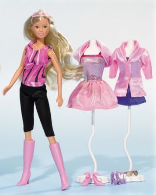 Steffi Love z ubrankami to lalka z akcesoriami w pudełku, które może służyć jako szafa. Świetna zabawa przeniesie Twoją Pociechę wprost na wybieg. 2 pary butów - różowe kozaczki do kolan i fioletowe sandały na obcasie okulary przeciwsłoneczne w różowej oprawie granatowa...