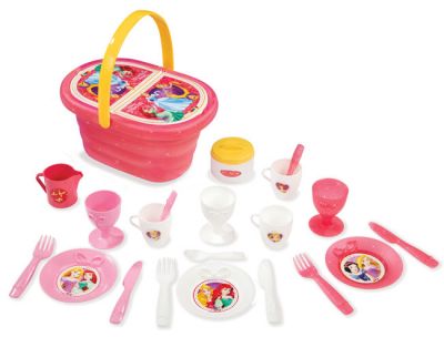 Smoby koszyk piknikowy z akcesoriami na licencji Disney PrincessZestaw zawiera:3 talerzyki, 3 kubeczki, 3 filiżanki, 3 łyżeczki, 3 nożyki3 widelczyki, Cukiernicę, Mlecznik.Koszyk jak i akcesoria śniadaniowe, utrzymane są w ślicznej, dziewczęcej kolorystyce i ozdobione brokatem...