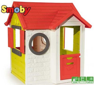 Nowy, realistyczny domek w ciekawej, wiosennej kolorystyce z elektronicznym dzwonkiem do drzwi. Domek posiada okrągłe okienko tuż przy drzwiach wejściowych. Okno na ściance bocznej wyposażone w otwierane okiennice. Powłoka anty UV - nie zmienia kolorów pod wpływam działania promieni...