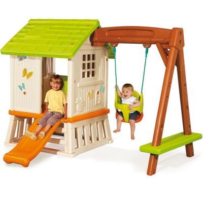 Niezwykły domek z huśtawka i zjeżdżalnią wykonany z tworzywa odpornego na warunki atmosferyczne oraz promienia UV. Podłoga znajduje się około 50 cm nad ziemią. Ślizg długości 100 cm.