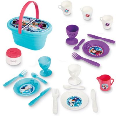 Smoby koszyk piknikowy z 20 akcesoriami min 3 łyżeczki 3 talerzyki, 3 kubeczki, 3 łyżeczki, 3 nożyki i 3 widelczyki, cukiernicę, mlecznik, i inne. Zarówno koszyk jak i akcesoria śniadaniowe, utrzymane są w ślicznej, dziewczęcej kolorystyce i ozdobione motywem postaci z bajki.