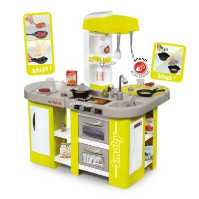 Kuchnia miniTefal Studio XLElektroniczna kuchnia z dźwiękiem - odgłosem gotowania; z garnkiem z makaronem, z rybką i kotletem usmażonymi z jednej strony, z patelnią do przerzucania naleśników, wiele miejsca do zabawy - blat, zlewozmywak, ekspres do kawy, saturator, lodówka, piekarnik,...