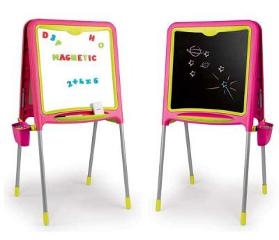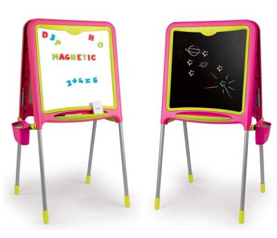 Tablica posiada dwie strony. Jedna do pisania kredą, druga przystosowana jest do specjalnych, wycieranych suchą szmatką, flamastrów. Tablica wykonana jest w większości z elementów metalowych co sprawia, że jest bardzo stabilna oraz daje gwarancję jakości na wiele lat.Dzięki magnesom...